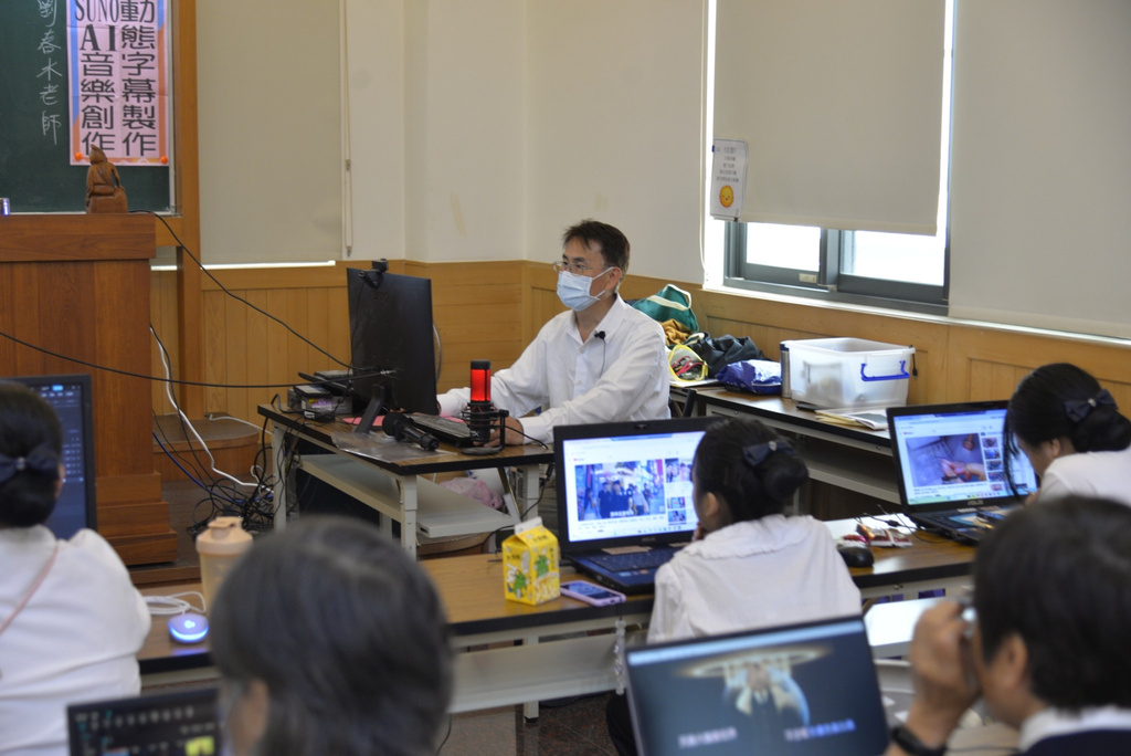 課程內容涵蓋AI音樂創作、影音剪輯、生成式網站應用及影像設計等面向,從基礎操作到進階應用,循序漸進,強調「零基礎也能上手」。劉春木講師以實務導向教學,帶領學員現場操作,將抽象概念轉化為具體成果。課堂中學員專注投入,彼此交流學習,氣氛熱絡。